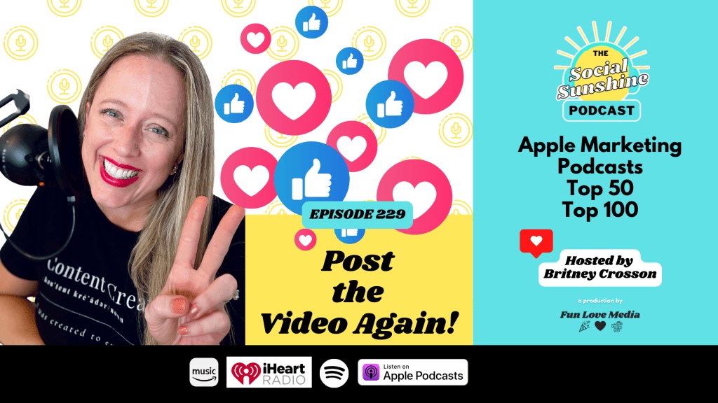 Pressed for time or wanting to be extra efficient? Post your successful videos again. Britney shares how to snag the videos without logos or watermarks and get them posted to your social media accounts again. She also explains why it’s not only okay to do this – but recommended!