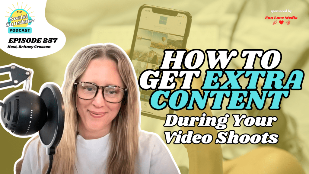 #257: Get the most out of your video content shoots by following the tips that Britney shares in this episode. She’s explaining how her team at Fun Love Media handles client content shoots and how she handles her own. There are multiple ways to get more bang for your buck when you’re capturing content so that you end up with camera facing videos, behind the scenes videos and plenty of photos.